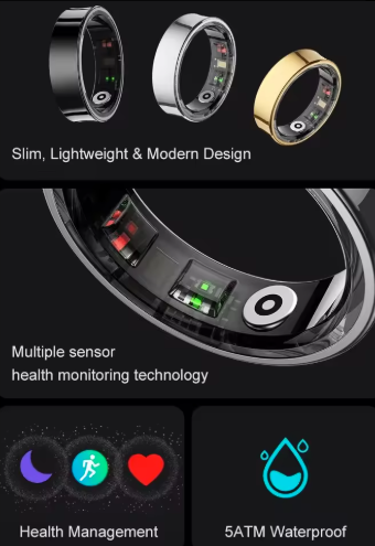 A stylish and durable smart ring designed to track your health and fitness seamlessly—without the bulk of a smartwatch. Built for both men and women, it blends fashion with powerful health-tracking features.